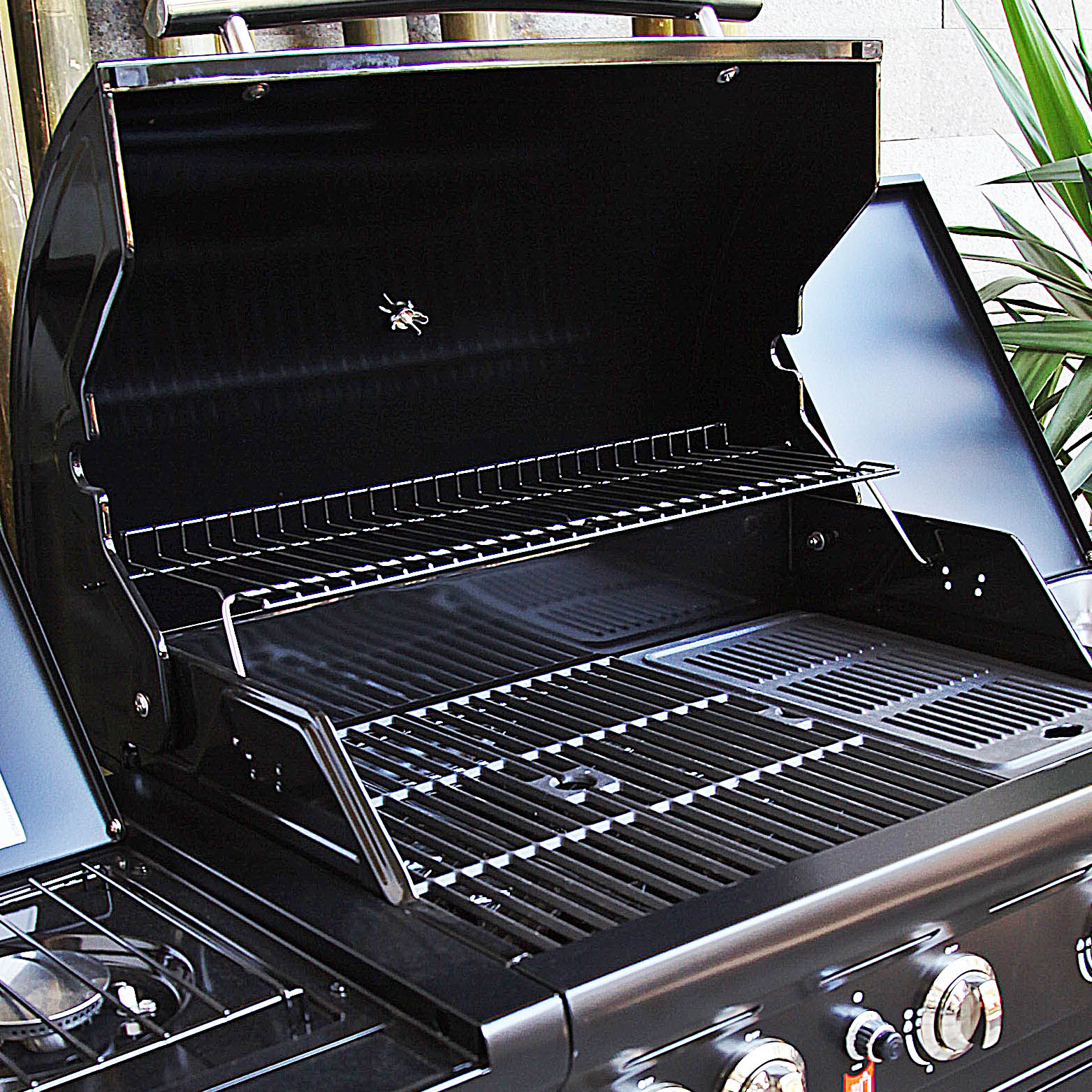 Hazırlıklarınız üzerinde tam kontrol sağlayan entegre bir termometreye sahiptir. Elektronik ateşleme güvenli kullanımı garanti eder. Çelik brülörler ve dökme demir ızgaralar son derece güçlü performans sağlar. Kullanışlı yan ocak ve yan servis rafı altında bulunan çelik yiyecek muhafaza kabı ile daha hızlı pratik işler yapabilirsiniz.